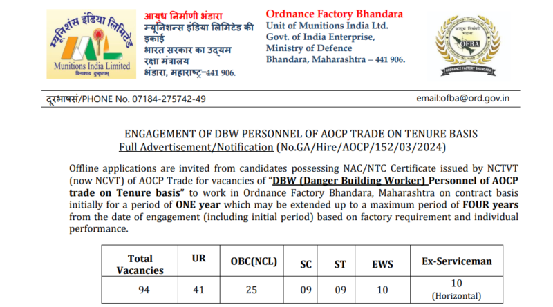 Ordnance Facotry Bhandara Recruitment 2024: Offline applications are invited from candidates possessing NAC/NTC Certificate issued by NCTVT (now NCVT) of AOCP Trade for vacancies of “DBW (Danger Building Worker) Personnel of AOCP trade on Tenure basis” to work in Ordnance Factory Bhandara, Maharashtra on contract basis initially for a period of ONE year which may be extended up to a maximum period of FOUR years from the date of engagement (including initial period) based on factory requirement and individual performance. Ordnance Factory Bhandara Recruitment Offline form apply before 23-11-2024. Ordnance Factory Bhandara Recruitment 2024 for ITI NCVT AOCP trade candidates. Interested candidates can Apply Ordnance Factory Recruitment 2024 and read full notification given below.