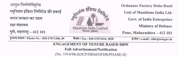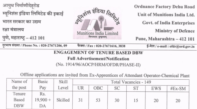 Offline applications are invited from Ex-Apprentices of Attendant Operator-Chemical Plant (AOCP) trade who are Ex-apprentices of AOCP trade (NCTVT) from Ordnance Factories OR having AOCP trade (NCTVT) from Government/Private organization having affiliation from Government and having AOCP (NCTVT) from Government ITI for filling up of unfilled vacancies of Tenure based DBW (Danger Building Worker) Personnel on CONTRACT BASIS, to work in Ordnance Factory Dehu Road, Pune (Maharashtra), a unit of Muntitions India Limited, Government of India Enterprises, Ministry of Defence, initially for a period of ‘ONE year which may be extended upto a maximum period of FOUR years from the date of engagement, including initial period, based on requirement of Ordnance Factory Dehu Road, Pune and individual’s performance.