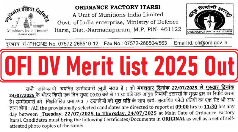 Ordnance Factory Itarsi DV Merit list 2025 Out, Check Now