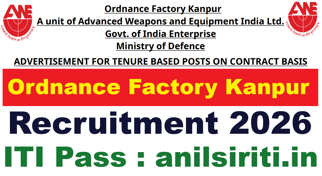 Ordnance Factory Kanpur Recruitment 2026 Out: Ordnance Factory Kanpur Recruitment 2026: Ministry of Defence के अंतर्गत AWEIL की Unit — Ordnance Factory Kanpur ने 151 Contract Posts पर भर्ती निकाली है। दो Advertisements हैं — Advt. 01 में 116 Machinist (SS) posts और Advt. 02 में 35 posts (Examiner, Electroplater, Fitter, Electrician/Wireman, Welder, Heat Treatment Operator)। Qualification: 10th Pass + NTC/NAC (NCVT)। Age: 18–35 वर्ष। Salary: ₹18,000 Basic Pay + DA + HRA। Selection: NCVT Marks (80%) + Trade Test (20%) से Merit List। Application Offline (By Post) है। Fee ₹100 DD (SC/ST/ExSM/PH Free)। Application Form aweil.in से Download करें और 08 April 2026 तक Post करें।