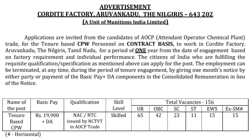 Ordnance Factories Recruitment 2024: Applications are invited from the candidates of AOCP (Attendant Operator Chemical Plant) trade, for the Tenure based CPW Personnel on CONTRACT BASIS, to work in Cordite Factory, Aruvankadu, The Nilgiris, Tamil Nadu, for a period of ONE year from the date of engagement based on factory requirement and individual performance. The citizens of India who are fulfilling the requisite qualification/specification as mentioned above can apply for the post. The employment can be terminated, at any time, during the period of tenure engagement, by giving one month’s notice by either party or payment of the Basic Pay+ DA components in the Consolidated Remuneration in lieu of the Notice.