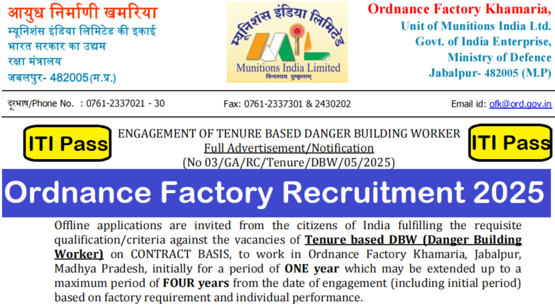 Offline applications are invited from the citizens of India fulfilling the requisite qualification/criteria against the vacancies of Tenure based DBW (Danger Building Worker) on CONTRACT BASIS, to work in Ordnance Factory Khamaria, Jabalpur, Madhya Pradesh, initially for a period of ONE year which may be extended up to a maximum period of FOUR years from the date of engagement (including initial period) based on factory requirement and individual performance.
