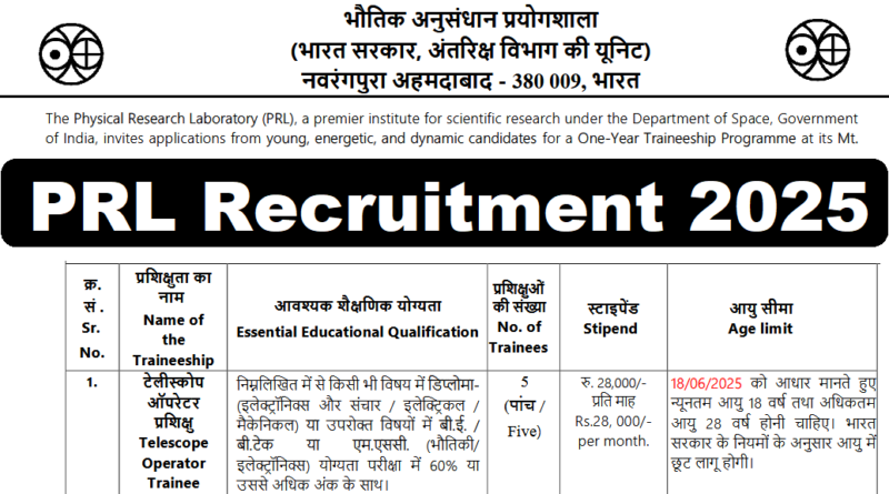 PRL Recruitment 2025, Diploma & Graduate Pass Latest vacancy 2025, 16/06/2025 Last Date