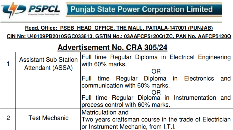 PSPCL ASSA & Test Mechnaic Recruitment 2024: Punjab State Power Corporation Limited (PSPCL) invites online applications for vacancies of Assistant Sub-Station Attendant & Test Mechanic vide CRA-305/24. Th e online applications are to be received from 05.03.2024 to 26.03.2024. Prospective candidates are advised to visit “Recruitment Tab” on PSPCL website (www.pspcl.in) for detailed advertisement and for submission of online applications upto 26.03.2024. PSPCL ASSA & Test Mechanic Recruitment for ITI Pass Electrician/Wireman Trades candidates.PSPCL ASSA & Test Mechanic Recruitment online application information given below.