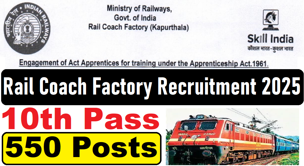 Rail Coach Factory Recruitment 2025, 550 Posts, 10th+ITI Pass Latest Vacancy 2025, 07/01/2026 Last Date