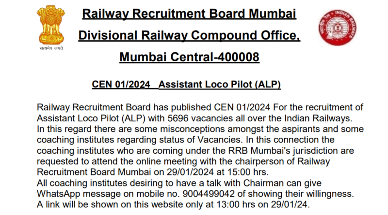 - Railway Recruitment Board has published CEN 01/2024 For the recruitment of Assistant Loco Pilot (ALP) with 5696 vacancies all over the Indian Railways. In this regard there are some misconceptions amongst the aspirants and some coaching institutes regarding status of Vacancies. In this connection the coaching institutes who are coming under the RRB Mumbai’s jurisdiction are requested to attend the online meeting with the chairperson of Railway Recruitment Board Mumbai on 29/01/2024 at 15:00 hrs. All coaching institutes desiring to have a talk with Chairman can give WhatsApp message on mobile no. 9004499042 of showing their willingness. A link will be shown on this website only at 13:00 hrs on 29/01/24.