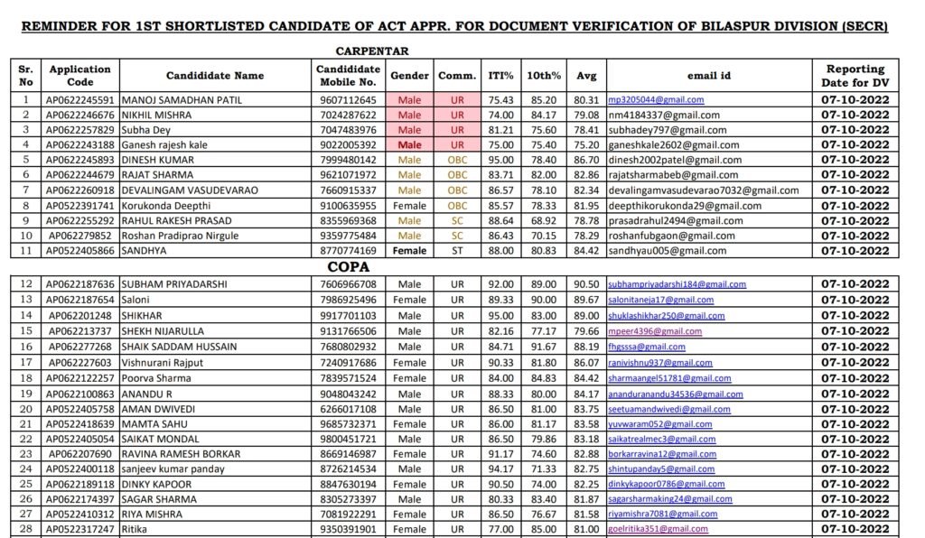 SECR Bilaspur Apprentice Document Verification Reminder Merit List: South East Central Railway Bilaspur की तरफ से ITI Pass छात्रों के लिए Apprentice निकली थी जिसका पहली बार Document Verification कराने का Railway Recruitment Cell South East Central Railway Bilaspur द्वारा 10 September 2022 को merit list जारी किया गया था जिसका Document Verification 14 September 2022 से शुरू हो गया था । SECR Bilaspur Apprentice Document Verification में काफी ITI Pass छात्र अनुपस्थित रहे। अनुपस्थित छात्रों को SECR Bilaspur ने एक और मौका दिया है ताकि Document Verification करा लें । अधिक जानकारी के लिए video जरूर देखें।