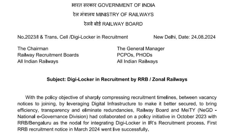 Railway Board latest official notice out 2024, Digi-Locker in Recruitment by RRB Zonal Railways