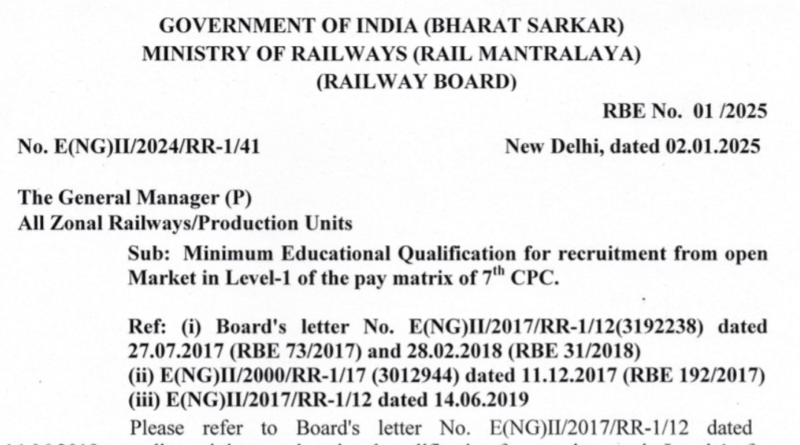 Railway Board RBE No. 01/2025 Official Notice Out: Railway Recruitment Board की ओर से Railway Level 1 Posts की recruitment के लिए Minimum Qualification के बारे में Official Notice के माध्यम से जानकारी दी हुई है | Railway Recruitment Board RBE No. 01/2025 official notice में RRB Level 1 Pay Matrix 7th CPC Posts की minimum qualification की जानकारी दी गई है | Railway Level 1 Posts Recruitment 2025 के लिए 10th Pass or ITI or equivalent or National Apprenticeship Certificate होनी चाहिए |