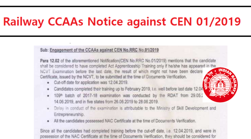 Railway CCAAs Latest Notice 2023: Railway Group D recruitment 2019 का CBT Exam होने के बाद document verification हुआ फिर CCAAs वाले candidates को कई zone से notice आना शुरू हुआ की Cut off date के बाद का Certificate होने के कारण सभी को रद्द किया जा रहा है | कितना दुःख होगा जब 2019 की vacancy 2022 में CBT Exam 2023 DV और ME होने बाद Pending कर दिया जाए या reject कर दिया जाए | एक दो candidates के साथ हो तो चलता है | सैकड़ों ऐसे candidates जिसका CBT Exam, DV, ME के बाद Pending है | सभी साथी Joining letter ले रहे है और इन्हें reject कर दिया गया | इन्हीं सवालो को लेकर AIRF के General Secretary ने Hon’ble Railway Minister को एक Letter दिया है जिसमे CCAAs 109 batch के सभी समस्या को बताया गया है | उम्मीद है Ministry of Railway कोई संज्ञान लेगी |