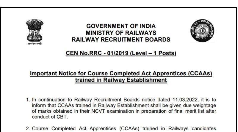 - In contitution of Railway Recruitment board notice dated 11th March 2022 it is to inform that double si double a has trend in railway establishment cell will given leave weightage of Mark obtain their NCVT examination in preparation of final merit list after conduct of CBT.