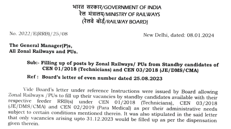 - Vide Board’s letter under reference Instructions were issued by Board allowing Zonal Railways /PUs to fill up their vacancies by standby candidates available with their respective feeder RRB(s) under CEN 01/2018 (Technicians), CEN 03/2018 (JE/DMS/CMA) and CEN 02/2019 (Para Medical) as per their administrative needs subject to certain conditions mentioned therein. It was also stipulated in the said letter that only vacancies arising upto 31.12.2023 would be filled up as per the dispensation given therein.