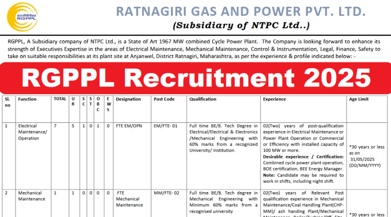 RGPPL, A Subsidiary company of NTPC Ltd., is a State of Art 1967 MW combined Cycle Power Plant. The Company is looking forward to enhance its strength of Executives Expertise in the areas of Electrical Maintenance, Mechanical Maintenance, Control & Instrumentation, Legal, Finance, Safety to take on suitable responsibilities at its plant site at Anjanwel, District Ratnagiri, Maharashtra, as per the experience & profile indicated below: –