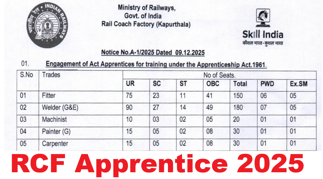 RCF Kapurthala Apprentice 2025: Online applications are invited in the prescribed format for engagement of 550 Act-Apprentices for imparting training in Technical Training Centre, Rail Coach Factory (Kapurthala) under the Apprenticeship Act, 1961, for the following trades. The eligible candidates can register their applications online on the prescribed proforma on the authorized website www.rcf.indianrailways.gov.in of Rail Coach Factory, Kapurthala by 07.01.2026 upto 24.00 hours. On 07.01.2026, after 24.00 hours, this link will be inactive. ITI Pass itter, Welder (G & E), Machinist, Painter (G), Carpenter, Mechanic Motor Vehicle, Electrician, Electronic Mechanic, MRAC Trade के candidates Online form apply कर सकते हैं | RCF Apprentice 2025 Apply link निचे दिया हुआ है | RCF Apprentice 2025 Full Notification निचे दी गयी है |