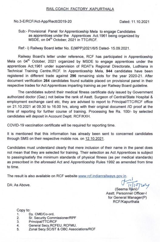4-October-2021 को पुरे भारत में apprentice mela लगा था उसी समय RCF Kapurthala में में 296 seats पर apprentice mela लगा जिसके लिए हजारो candidates ने भाग लिया था | जिसमे से 944 candidates ने अलग अलग ट्रेड से फॉर्म भरा जिसमे से document verification के बाद 264 candidates को ट्रेनिंग के लिए बुलाया गया है |