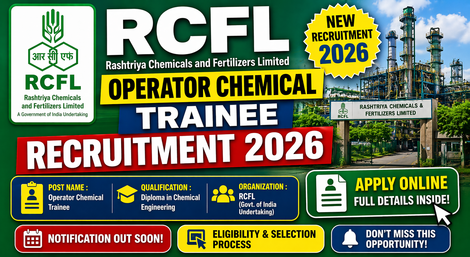 Disclaimer: यह post केवल जानकारी के उद्देश्य से है। Apply करने से पहले Official Notification (rcfltd.com) जरूर पढ़ें। Eligibility verify करने के बाद ही Fee जमा करें — Fee Non-Refundable है।