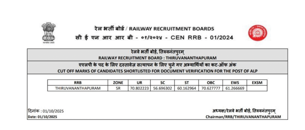 RRB Thiruvananthapuram ALP CBAT Cut off 2025