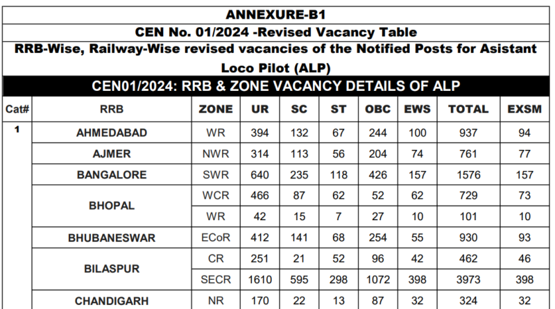 - In continuation to the Notice dated 19.06.2024 for enhancement of vacancies for ALP post under CEN 01/2024 the detailed revised vacancies of all participating RRBs along with various posts, community wise/ category wise are enclosed as CEN No. 01/2024- Revised vacancy Table: Annexure-B1.