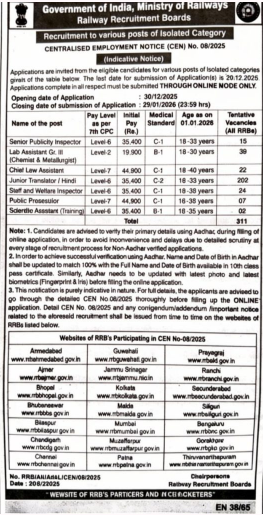 RRB Isolated Recruitment 2025 : Railway Recruitment Boards (RRB) की ओर से 311 Posts पर Recruitment निकली है जिसका Online form 30/12/2025 से शुरू है |RRB Isolated Recruitment 2025 Online form 29/01/2026 तक भरा जायेगा |12th, Diploma & Graduate Pass in various candidates RRB Isolated Recruitment 2025 online form भर सकता है | Interested and eligible candidates RRB Isolated Recruitment 2025 form भर सकते हैं | RRB Isolated Recruitment Short Notification निचे दिया गया हैI RRB Isolated Recruitment Apply Link निचे दिया गया है I