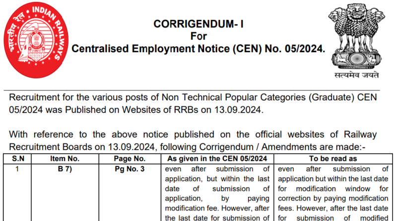 - Recruitment for the various posts of Non Technical Popular Categories (Graduate) CEN 05/2024 was Published on Websites of RRBs on 13.09.2024. With reference to the above notice published on the official websites of Railway Recruitment Boards on 13.09.2024, following Corrigendum / Amendments are made:-