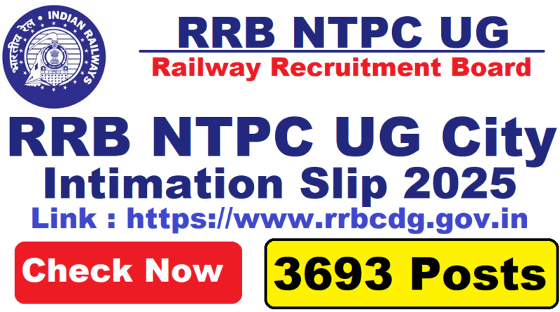 RRB NTPC UG City Intimation Slip 2025 : Railway Recruitment Board (RRB) की ओर से 3693 Posts पर Recruitment निकली थी जो Candidates RRB NTPC UG का Form भरे हुए हैं वे सभी Candidates RRB NTPC UG City Intimation Slip & Admit Card का इंतजार कर रहे हैंI RRB NTPC UG City Intimation Slip 28 July 2025 को जरी कर दिया गया हैI जिसे Computer Based Test भारत के कई Centre पर आयोजित की जाएगी। अपने NTPC UG City Intimation Slip ,Download करने के लिए RRB Official Website पर जाना होगा और अपने Registration Number or Password का उपयोग करके Log In करना होगा। RRB NTPC UG Admit Card 2025 Out हो चुकी है |
