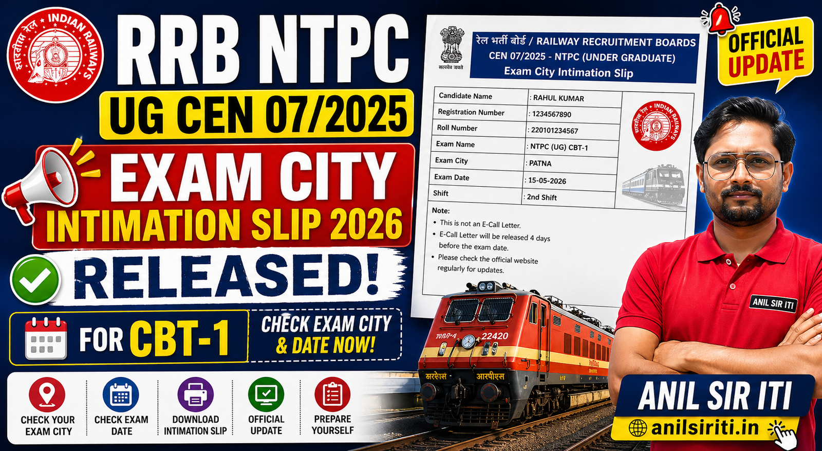 RRB NTPC UG City Intimation 2026 Out: Railway Recruitment Board (RRB) ने CEN 07/2025 (NTPC Under Graduate) के CBT-1 के लिए City Intimation Slip Link Live कर दिया है। Candidates अपनी Exam City, Date और SC/ST Travel Authority अभी देख सकते हैं। Exam 07 May से 21 June 2026 के बीच होगी। Aadhaar Biometric Authentication Exam Centre पर अनिवार्य होगा।