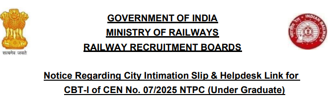 City Intimation Slip Notice – RRB NTPC UG CBT-1 | CEN 07/2025