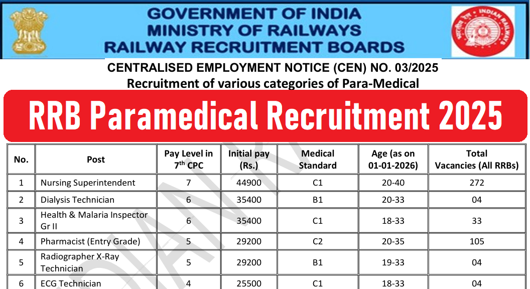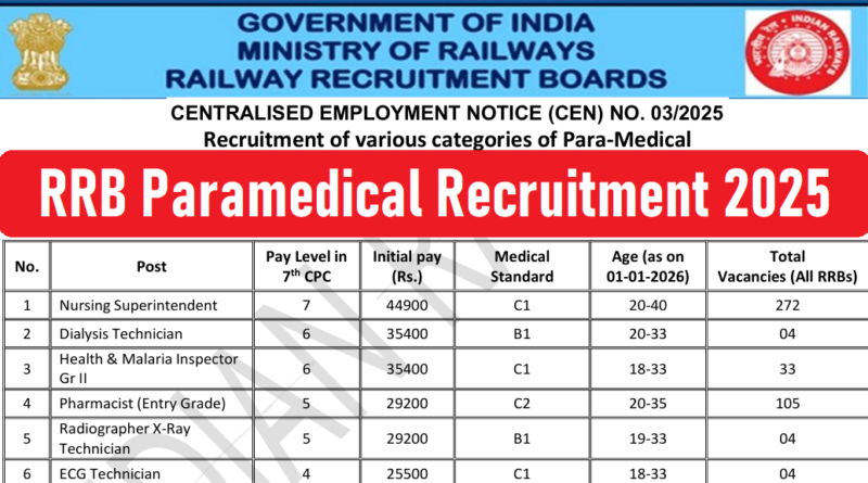 RRB Paramedical Recruitment 2025, 434 Posts, www.rrbapply.gov.in, 08/09/2025 Last Date