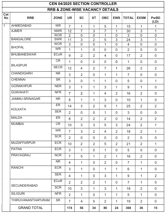 RRB Section Controller Recruitment 2025, 368 Posts, Graduate Pass Latest Vacancy 2025, 14/10/2025 Last Date