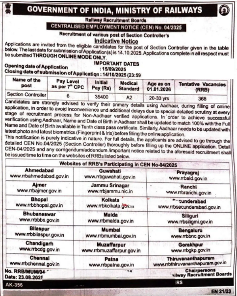 RRB Section Controller Recruitment 2025, 368 Vacancies, Section Controller Post Latest Vacancy 2025, 14/10/2025 Last date