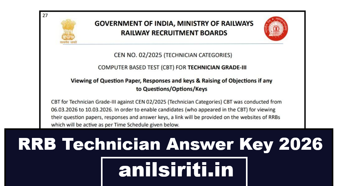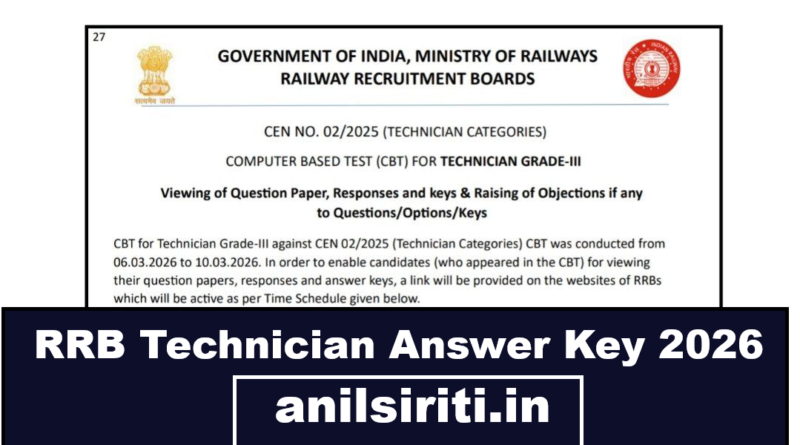 RRB Technician Answer Key 2026 Out: RRB Technician Grade-III CEN 02/2025 CBT Answer Key 2026 जारी हो गई है। परीक्षा 06 से 10 मार्च 2026 के बीच आयोजित हुई थी। Candidates अपने Questions, Responses और Answer Keys RRBs की Official Website पर देख सकते हैं। आपत्ति (Objection) दर्ज करने की अंतिम तिथि 27 मार्च 2026 सुबह 10:00 बजे है। Objection Fee: ₹50 प्रति प्रश्न (सही होने पर Refund)।