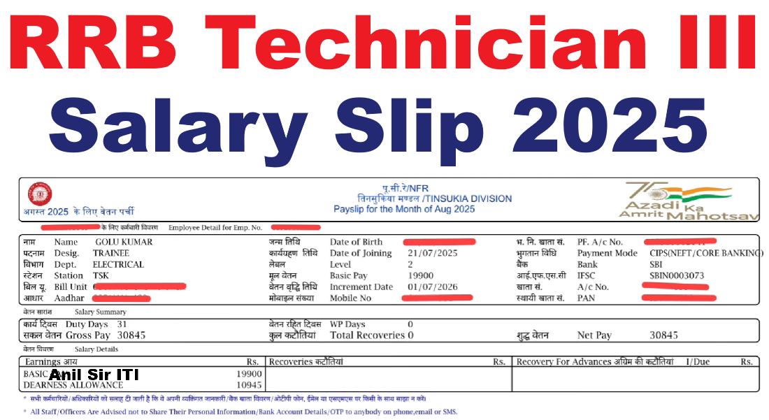 RRB Technician III Salary 2025: Railway Recrutment Board की ओर से ITI Pass Candidates के लिए Technician Grade III की Recruitment आती है | 2025 में भी RRB Technician III Recruitment निकली थी जिसके Exam का इंतजार candidates कर रहे हैं | RRB Technician III Recruitment 2025 की तैयारी कर रहे हैं तो Anil Sir ITI App download करके Mock Test, Practice Test दें सकते हैं | RRB Technician III की 2024 में भी Recruitment निकली थी जिसका Joining काफी सारे Candidates के हो चुके है | एक Candidates का RRB Technician में Joining 21-07-2025 को हुई थी जिसके Railway में काम करते हुए 1 महिना से अधिक हो गया | आज उसकी Railway Technician की Salary Slip आई जिसमे Railway Technician Salary की Actual Salary देखने को मिल रहा है |