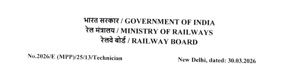Railway Board ने दिनांक 30 March 2026 को एक बड़ा आदेश जारी किया है। इस आदेश (No. 2026/E(MPP)/25/13/Technician) में Technician Grade के 6,565 पदों पर भर्ती के लिए Centralized Employment Notification (CEN) जारी करने की मंजूरी दी गई है।