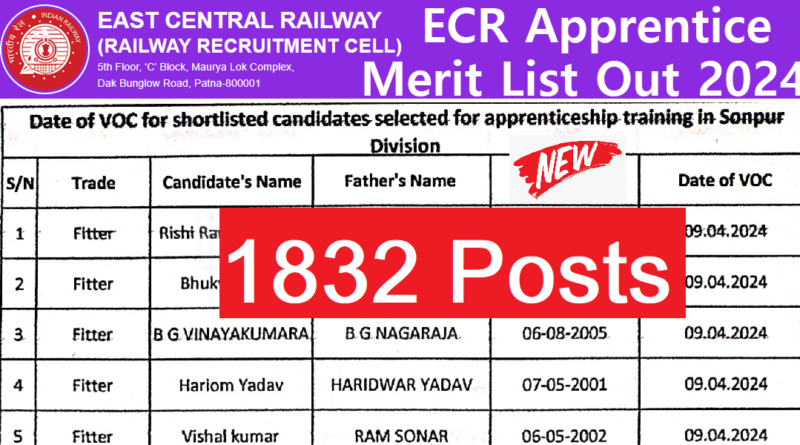East Central Railway Apprentice Merit list 2023-24 : ECR Patna की ओर से 1832 Posts पर Apprentice निकली थी जिसका Online form 09-12-2023 तक भरा गया था | ECR Apprentice Online form लाखों candidates ने भरा है और सभी अब ECR Apprentice Merit list का इंतजार कर रहे है | ECR Apprentice merit list कब आयेगी इसकी जानकारी इस post पर दी गई है | RRC ECR Apprentice Result जारी कर दिया गया है | East Central Railway Apprentice Result link निचे दी गई है | ECR Apprentice Selected candidates का cut off भी जारी कर दिया गया है | RRC ECR Apprentice Cut off 2023-24 pdf download करके चेक करें | East Central Railway Sonepur Division Apprentice का Document verification Merit list जारी कर दिया गया है | ECR के अन्य unit का Document verification Merit list भी जारी किया गया है |