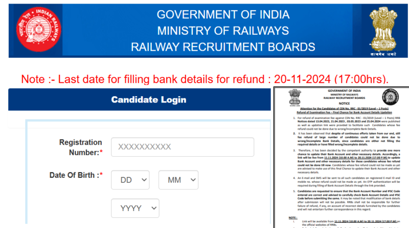 - For refund of examination fee against CEN No. RRC – 01/2019 (Level – 1 Posts) RRB Notices dated 13.04.2023, 21.04.2023 , 03.05.2023 and 25.04.2024 were published as well as updation link were provided to facilitate such Candidates whose fee refund could not be done due to wrong/incomplete Bank Details.