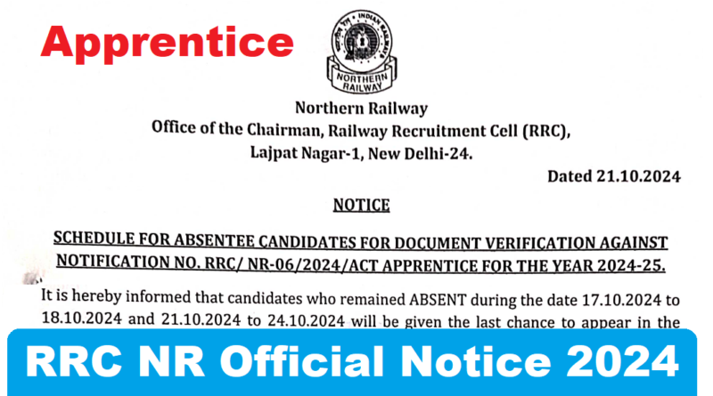 RRC NR Apprentice Important Official Notice 2024: Railway Recruitment Board Northern Railway की ओर से ITI Pass Various Trades candidates के लिए 4096 Posts पर Recruitment निकली थी जिसका Online form 16-09-2024 तक भरा गया था | RRC NR Apprentice 1st Result 05-10-2024 को जारी किया गया था | RRC NR Apprentice Document Verification 17.10.2024, 18.10.2024 और 21.10.2024 से 24.10.2024 तक होने के बाद जो जो Absent candidates हैं उन्हें एक बार फिर Document Verification के लिए मौका दिया गया है |