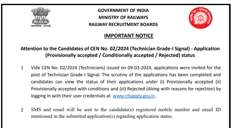Attention to the Candidates of CEN No. 02/2024 (Technician Grade-I Signal) – Application (Provisionally accepted / Conditionally accepted / Rejected) status