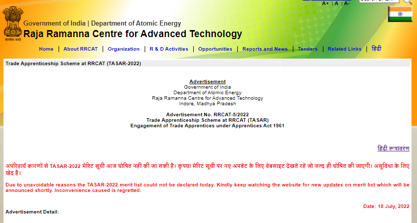 RRCAT Apprentice Merit list 2022, TASAR Apprentice Result 2022