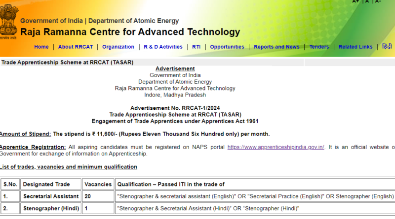 RRCAT Apprentice Recruitment 2024: Applications are invited for engagement of 21 numbers of Trade Apprentices in Secretarial Assistant trade and stenographer (Hindi) trade under extant provisions of Apprentices Act, 1961 and Apprenticeship Rules, 1992 at Raja Ramanna Centre for Advanced Technology (RRCAT), Indore, Madhya Pradesh. The date of commencement of the batch is 23/08/2024 and the duration of the apprenticeship is 1 year. The trade apprenticeship scheme at RRCAT is a part of National Apprenticeship Promotion Scheme (NAPS).