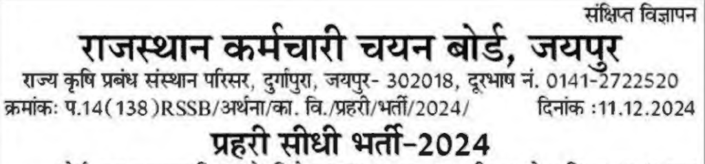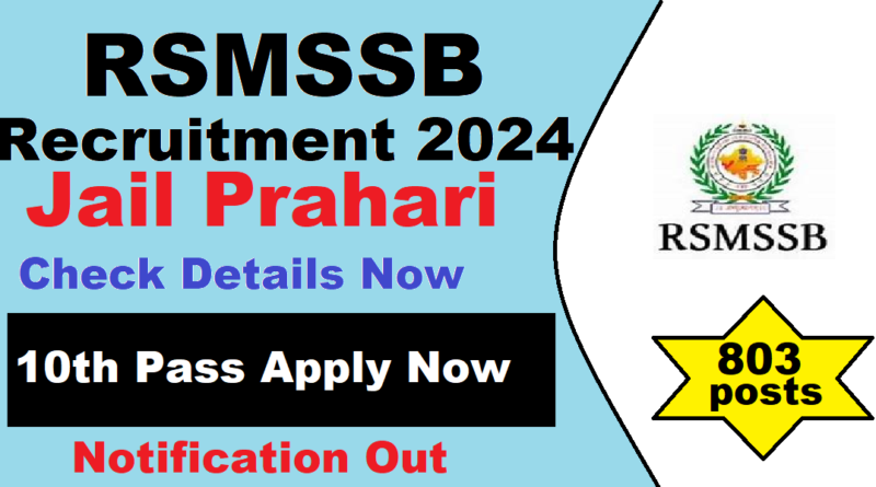 RSMSSB Jail Prahari Recruitment 2024: The Rajasthan Staff Selection Board (RSSB) की ओर से 803 Posts पर Recruitment निकली है जिसका Online form 24/12/2024 से शुरू है | RSMSSB Recruitment 2024 Online form 22/01/2025 तक भरा जायेगा | 10th Pass candidates RSMSSB Recruitment 2024 online form भर सकते है | Interested and eligible candidates RSMSSB Recruitment 2024 form भर सकते हैं |RSMSSB Recruitment 2024 का Notification Link जानकारी निचे दी गई है |RSMSSB Recruitment 2024 का Apply Link जानकारी निचे दी गई है |