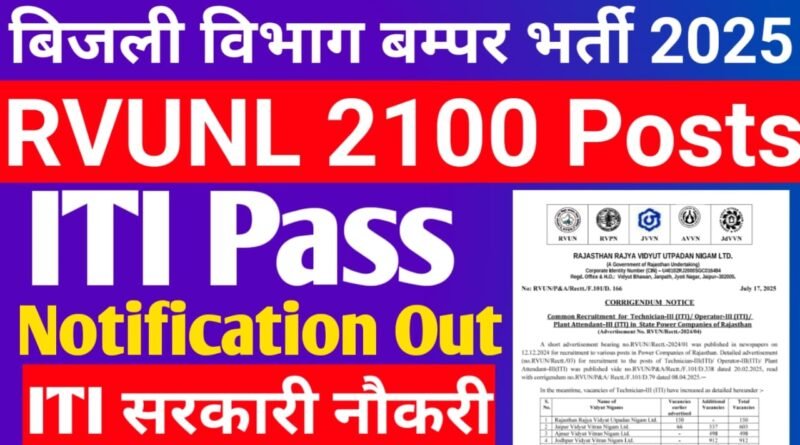 बिजली विभाग की निकली बम्पर भर्ती 2025 : Rajasthan Rajya Vidhyut Utpadan Nigam Limited की ओर से ITI Pass Candidates के लिए Technician-III(ITI)/ Operator-III(ITI)/ Plant Attendant-III(ITI) Posts पर Recruitment निकली है जिसका Online form Reopen 01 August 2025 में भरा जायेगा | ये Recruitment Feb 2025 में निकली थी लेकिन उस समय ये 216 Posts पर Recruitment निकली थी लेकिन अब Seats बढ़ गयी है अब Ajmer Vidyut Vitran Nigam Ltd., Jodhpur Vidyut Vitran Nigam Ltd. और Jaipur Vidyut Vitran Nigam Ltd. की Seats बढ़ गयी है | बहुत जल्द ही फिर से RRVUNL Technician-III(ITI)/ Operator-III(ITI)/ Plant Attendant-III(ITI) Recruitment 2025 के Online form ओर Notification जारी किया जायेगा | RRVUNL Technician-III(ITI)/ Operator-III(ITI)/ Plant Attendant-III(ITI) Recruitment 2025 की जानकारी समय समय पर Anil Sir ITI App पर Upload की जाएगी | RVUNL Technician 2025 Modify Application 01-08-2025 से शुरू होगा | RVUNL Technician 2025 Modification 07-08-2025 तक कर सकते हैं | 2nd round में फिर से Link Active होगा जिन्होंने पहले फॉर्म नहीं भरा वो भी उस समय भर पाएंगे |