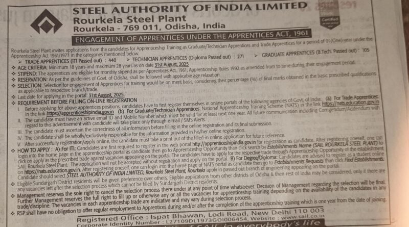 - Steel Authority of India Limited Sail Rourkela Trade / Technician / Graduate Apprentice Post Recruitment Notification 2025. Candidate Can Apply Between 31-07-2025 to 31-08-2025