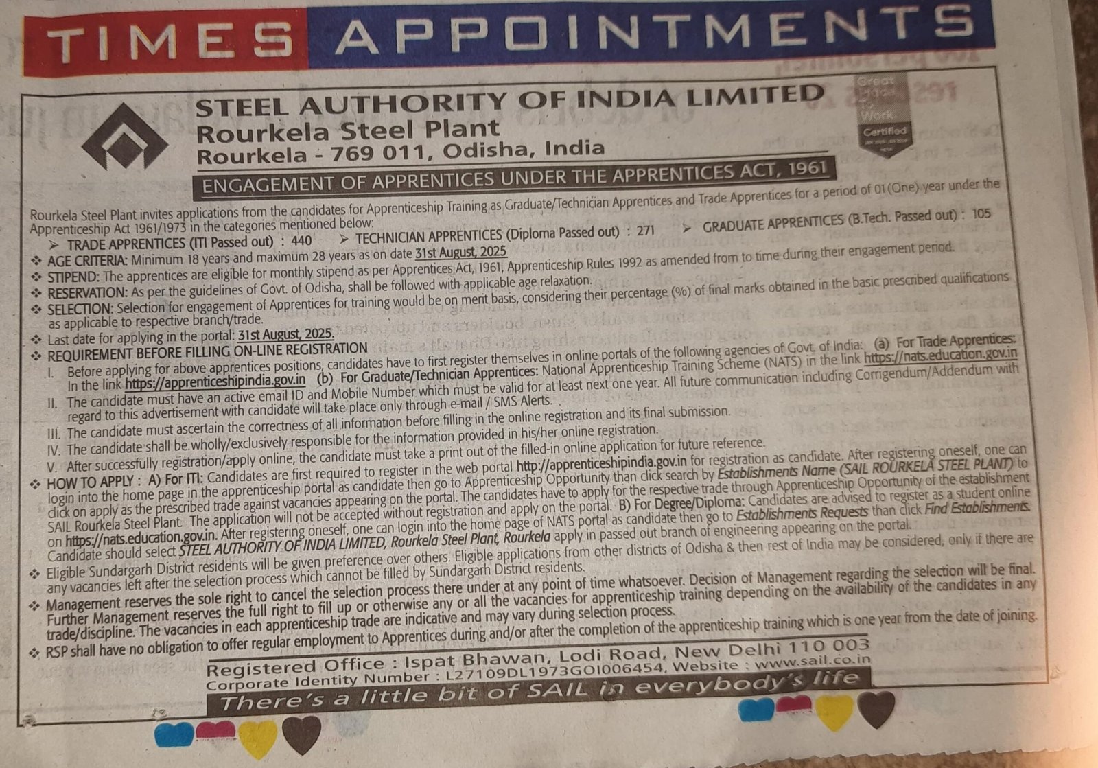 - Steel Authority of India Limited Sail Rourkela Trade / Technician / Graduate Apprentice Post Recruitment Notification 2025. Candidate Can Apply Between 31-07-2025 to 31-08-2025