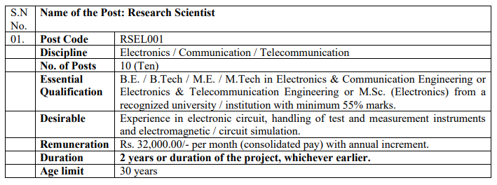 | Research Scientist | B.E. / B.Tech / M.E. / M.Tech in Electronics & Communication Engineering or Electronics & Telecommunication Engineering or M.Sc. (Electronics) from a recognized university / institution with minimum 55% marks. |
