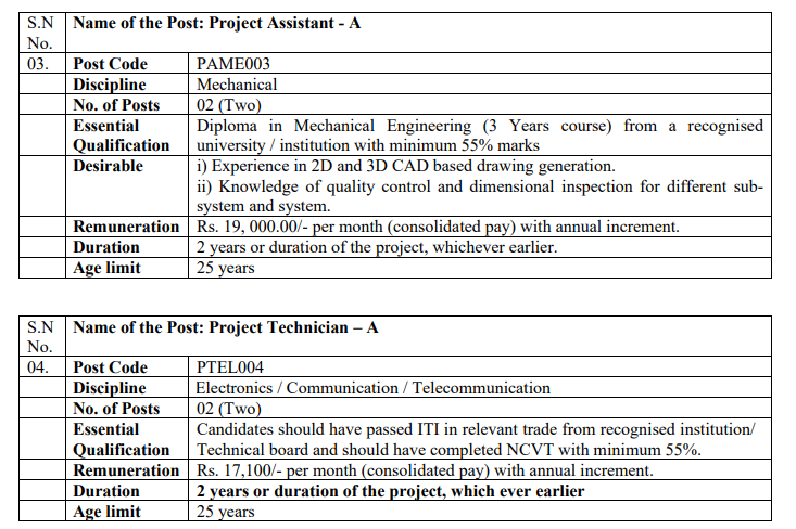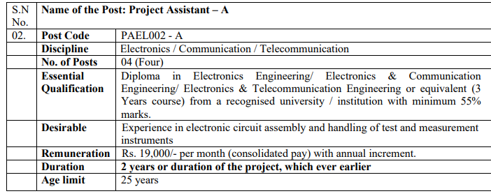 | Project Assistant | Diploma in Electronics Engineering/ Electronics & Communication Engineering/ Electronics & Telecommunication Engineering or equivalent (3 Years course) from a recognised university / institution with minimum 55% marks. |