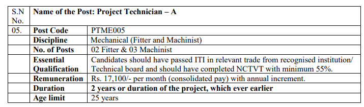 | Project Technician | Candidates should have passed ITI in relevant trade from recognised institution/ Technical board and should have completed NCVT with minimum 55%. |