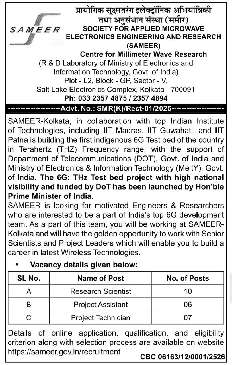 SAMEER Recruitment 2025 Full Notification Out, Scientist, Assistant & Project Technician Posts Latest Vacancy 2025