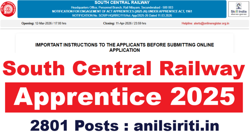 SCR Apprentice Recruitment 2026 Out, 2801 Post: RRC South Central Railway (SCR) Act Apprentice Recruitment 2025-26: South Central Railway ने 2,801 Act Apprentices की भर्ती के लिए Notification जारी किया है। Telangana, Andhra Pradesh, Maharashtra, Karnataka, Tamilnadu और Madhya Pradesh के eligible districts के candidates Apply कर सकते हैं। 13 Trades (Electrician, Fitter, COPA, Welder, AC Mechanic आदि) में Training दी जाएगी। Qualification: 10वीं में minimum 50% marks + ITI। Age: 15 से 24 वर्ष (SC/ST/OBC को relaxation)। Selection Merit Based होगा — कोई Written Test नहीं। Application Fee मात्र ₹100 (SC/ST/Female/PwBD को Free)। Online Apply 12 March से 11 April 2026 तक करें।