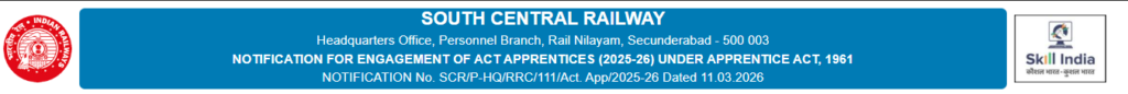 | Notification No. | SCR/P-HQ/RRC/111/Act.App/2025-26 Dated 11.03.2026 |