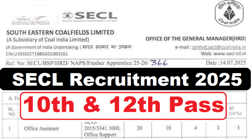 SECL Apprentice Recruitment 2025, 10th & 12th Pass Latest Vacancy 2025, 28/07/2025 Last Date